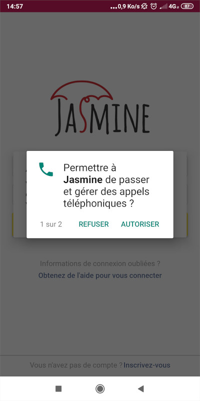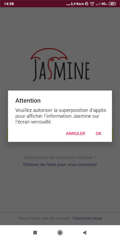 Une fois l'application installée, connectez-vous avec vos identifiants Jasmine. Pour des raisons de sécurité, il vous sera nécessaire de vous reconnecter au bout d'un mois de connexion.