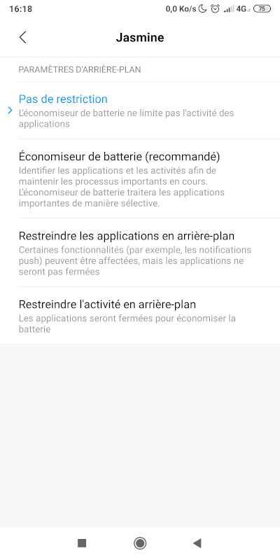 9. Toujours dans les paramètres de l'application Jasmine, dans économiseur de batterie, enlevez toutes les restrictions.Pour plus de détails sur l'installation, rendez-vous à cette adresse